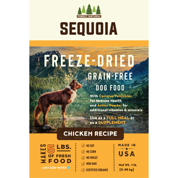 The Sequoia Freeze-Dried Grain-Free Dog Food is our most nutritious food made with the highest-quality, whole food ingredients which is prepared in small batches right here in the United States in a human-grade kitchen. And with the added immune supporting Coriolus Versicolor mushroom and mineral-rich antler powder...your pet is getting next level goodness. It is a fantastic combination of digestibility and palatability making it a perfect way to introduce natural feeding into your pet’s diet. This all-natural, grain-free recipe is an ideal choice for a pet with food sensitivities or a picky eater. You can use it as a full meal, food topper, or a supplement.