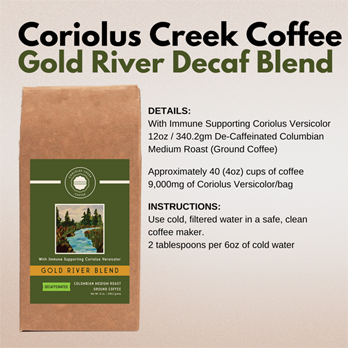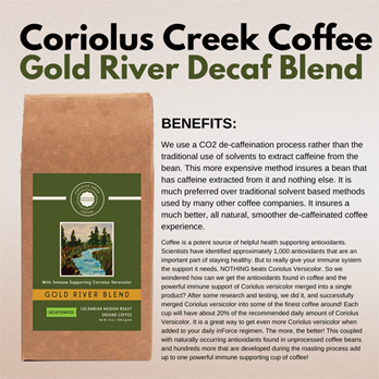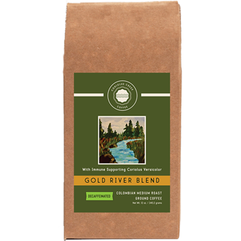 Gold River Blend is a rich, medium roast de-caffeinated, Columbian coffee that is ground to perfection and includes the powerful immune supporting supplement known as Coriolus Versicolor. This coffee is roasted, ground and shipped much faster than most coffees found in stores and at your local coffee house ensuring what we believe to be the freshest coffee flavored experience you can have. Every hand-packed bag is filled with the exceptional coffee you deserve. These large beans feature undertones of juicy lemons, brown sugar and milk chocolate that create a medium bodied, sweet tasting decaffeinated coffee with a rich flavor aroma. If you are new to buying freshly roasted coffee and don’t know where to begin, or it you’re a veteran, this selection will satisfy your coffee craving!