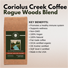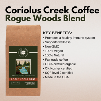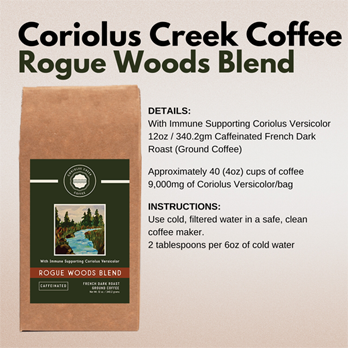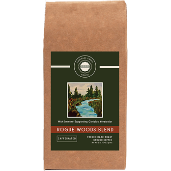 Rogue Woods Blend is a rich, French dark roast caffeinated, coffee that is ground to perfection and includes the powerful immune supporting supplement known as Coriolus Versicolor. This coffee is roasted, ground and shipped much faster than most coffees found in stores and at your local coffee house ensuring what we believe to be the freshest coffee flavored experience you can have. Every hand-packed bag is filled with the exceptional coffee you deserve. You will be surprised by how smooth and light it is on your palate!